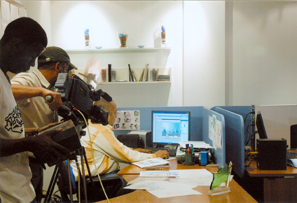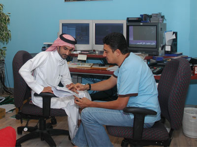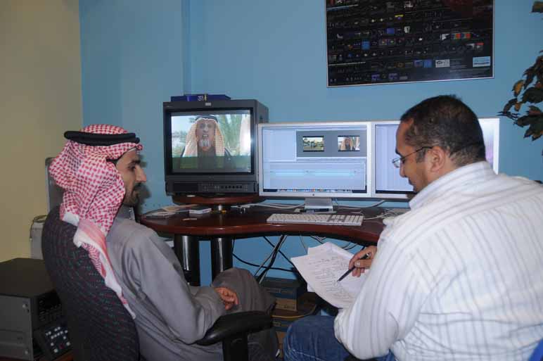 المخرج أحمد البنا يقوم بمراجعة مقطع من أول فيلم كارتوني سعودي للأطفال بينما يقوم مصورين قناة MBC بالتصوير لإعداد تقرير عن الفيلم
